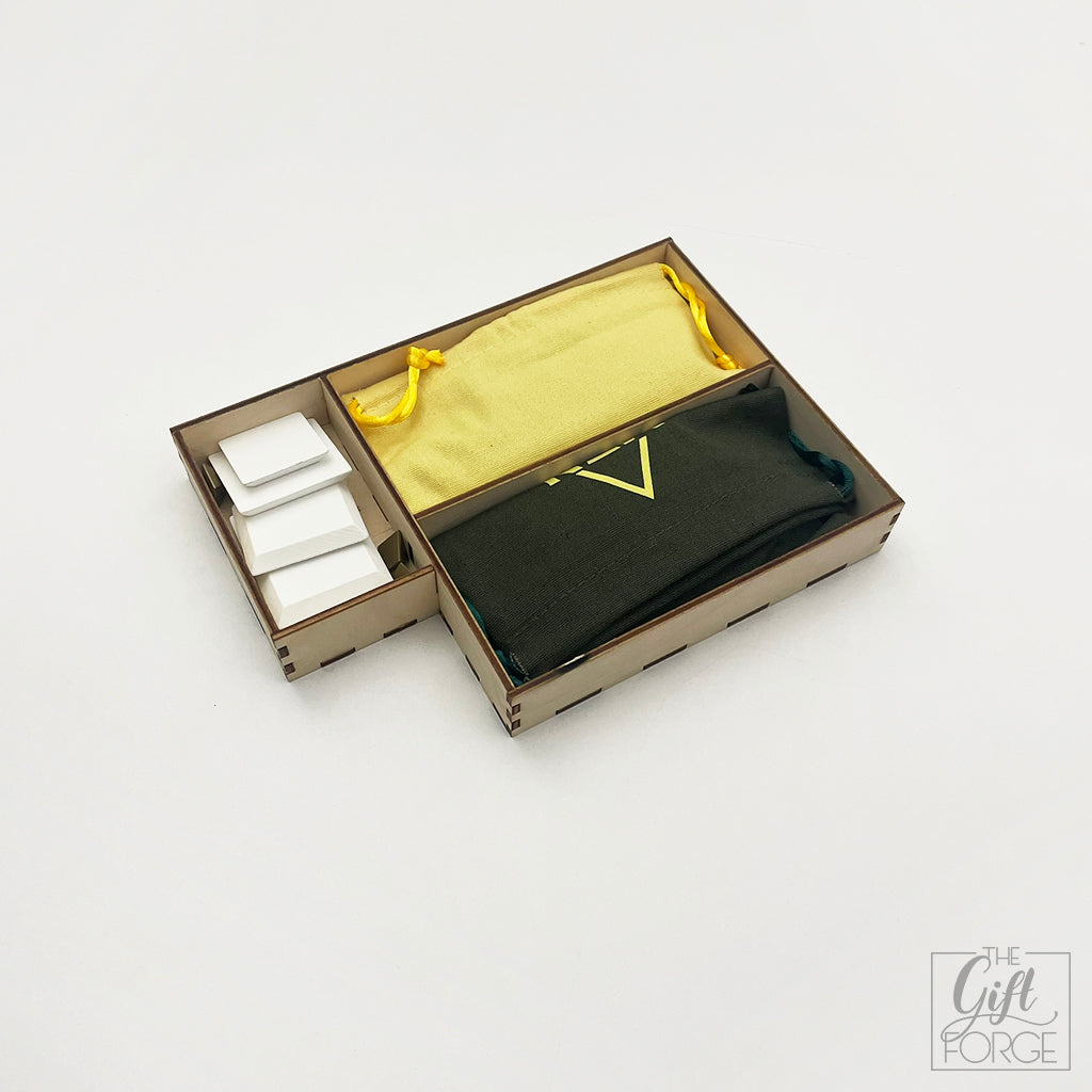 A különböző kiadások, ill. a gyártásból fakadó eltérések miatt a társasjáték dobozának mérete eltérhet a tervezés során használt doboz méretétől. Az insert megfelelő illeszkedése érdekében, kérjük, hogy mérd le a saját példányod dobozának belső méreteit.