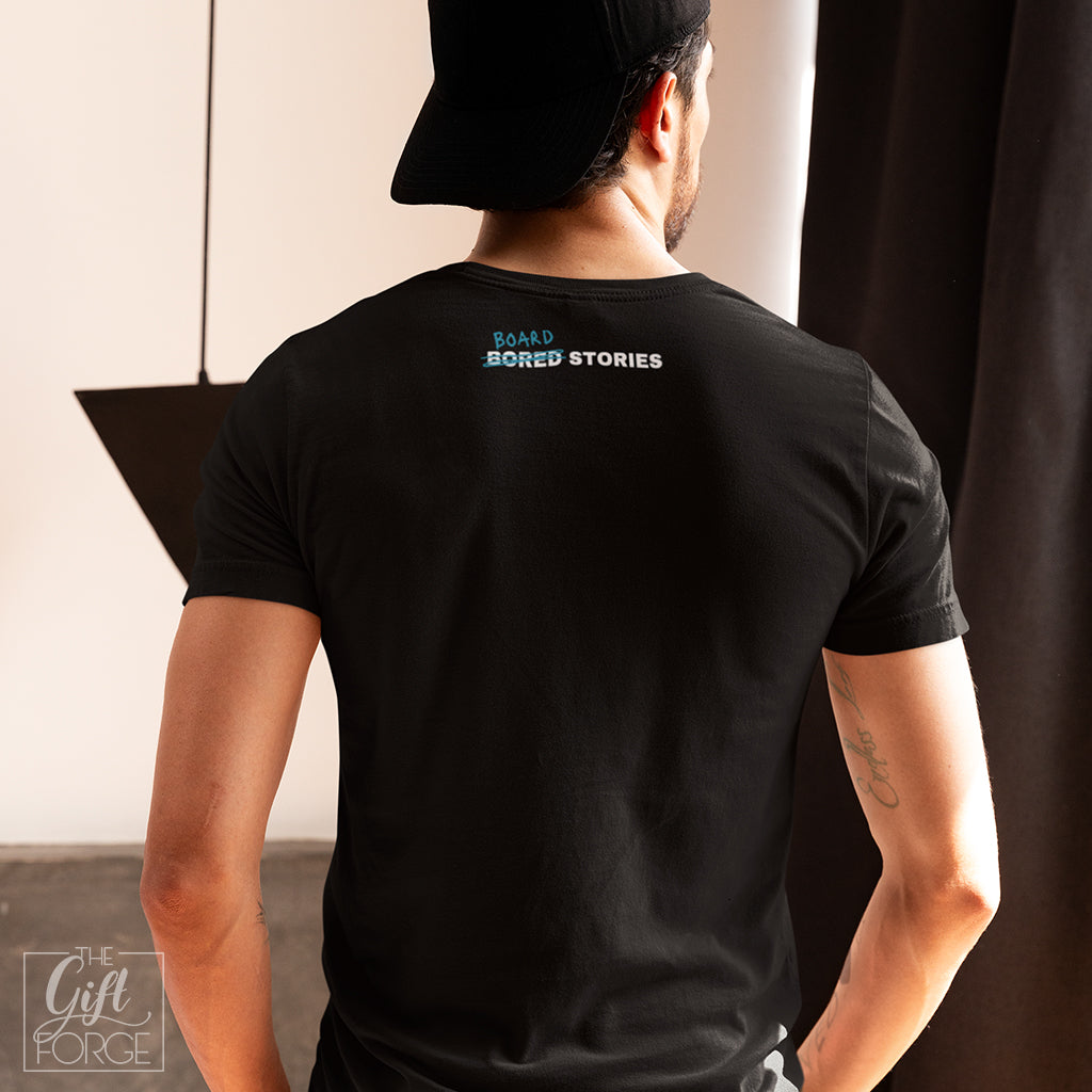 A póló elején színes meeple figura, hátul, a nyakrésznél a Board Stories logó kapott helyet.